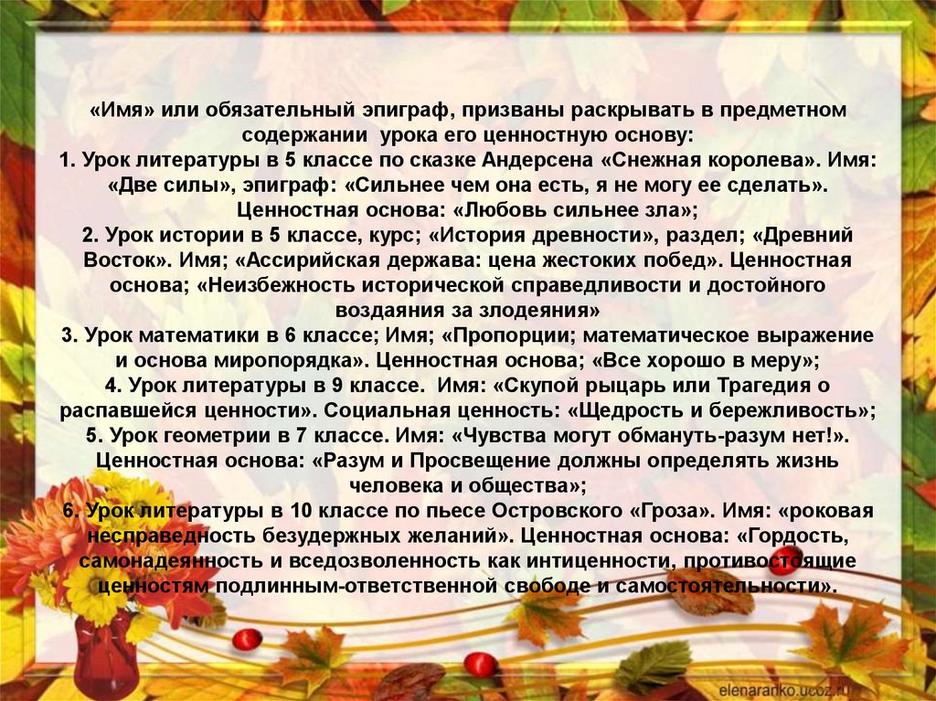 «Имя» или обязательный эпиграф, призваны раскрывать в предметномсодержании урока его ценностную основу: