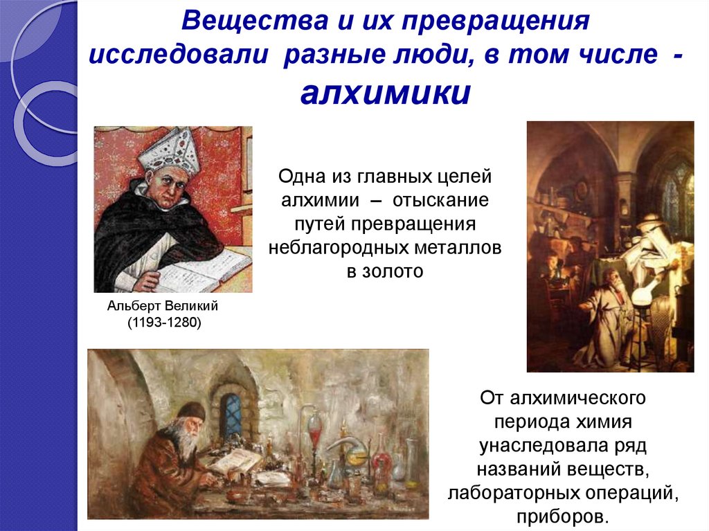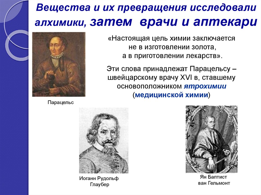 Вещества и их превращения исследовалиалхимики, затем врачи и аптекари и,