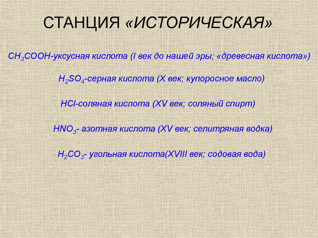 СТАНЦИЯ «ИСТОРИЧЕСКАЯ»СН3СООН-уксусная кислота (I век до нашей эры; «древесная кислота»)