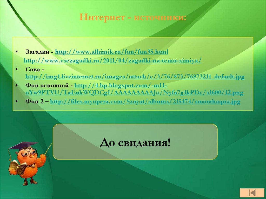 Интернет - источники:Загадки - http://www.alhimik.ru/fun/fun35.html