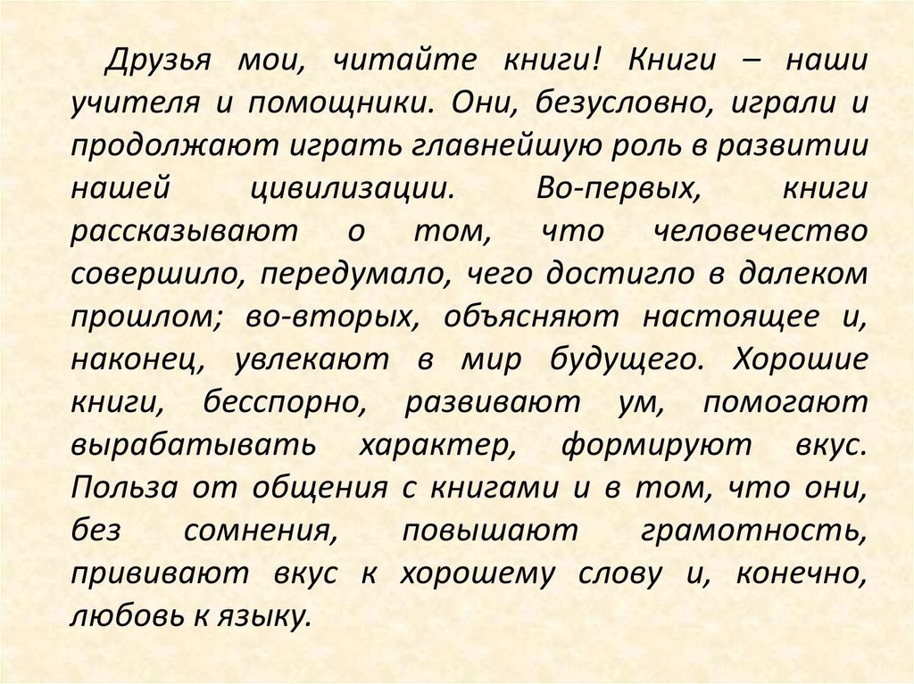 Друзья мои, читайте книги! Книги – нашиучителя и помощники. Они, безусловно, играли и