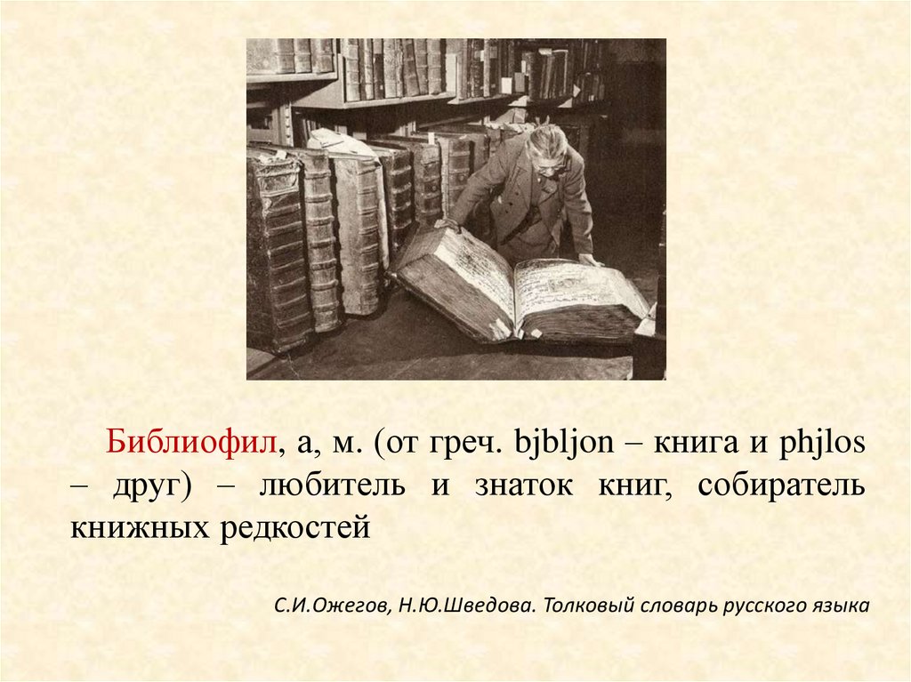 Библиофил, а, м. (от греч. bjbljon – книга и phjlos– друг) – любитель и знаток книг, собиратель