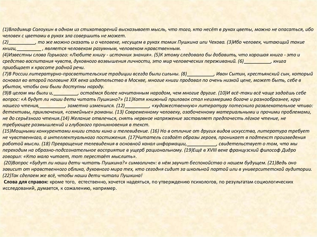 (20)Вопрос «Будут ли наши дети читать Пушкина?» символичен: в нём звучит беспокойство о нашем будущем. (21)Ведь оно