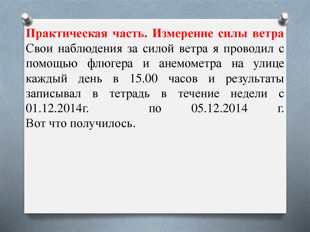 Практическая часть. Измерение силы ветраСвои наблюдения за силой ветра я проводил с