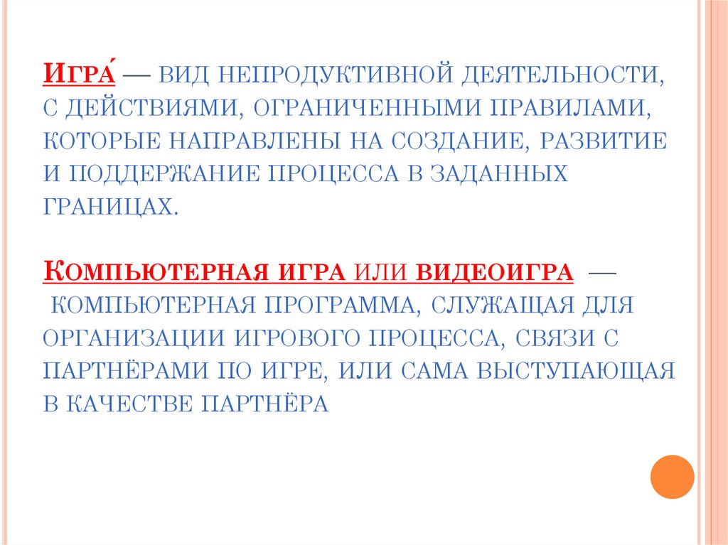 ИГРА́ — ВИД НЕПРОДУКТИВНОЙ ДЕЯТЕЛЬНОСТИ,С ДЕЙСТВИЯМИ, ОГРАНИЧЕННЫМИ ПРАВИЛАМИ,