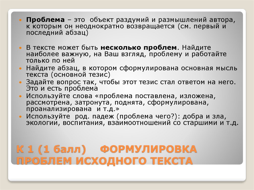 Проблема – это объект раздумий и размышлений автора,к которым он неоднократно возвращается (см. первый и