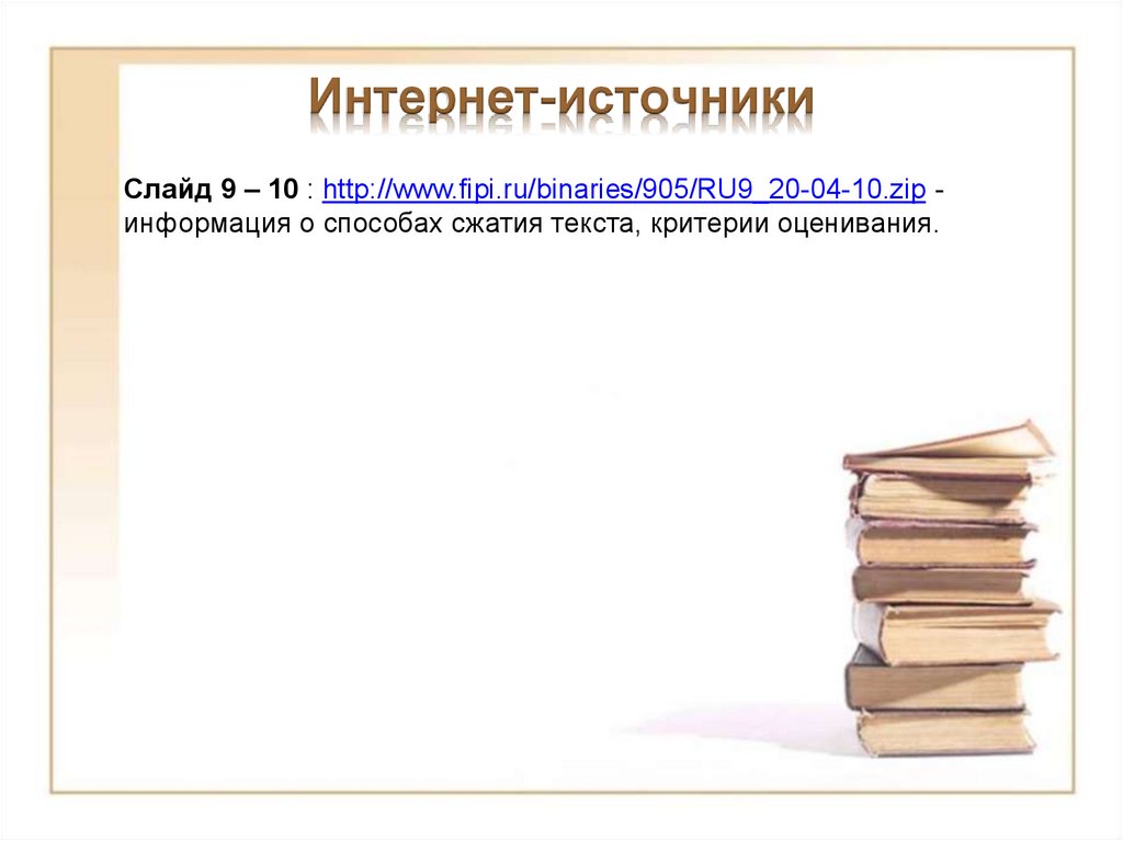 Интернет-источникиСлайд 9 – 10 : http://www.fipi.ru/binaries/905/RU9_20-04-10.zip информация о способах сжатия текста, критерии оценивания.