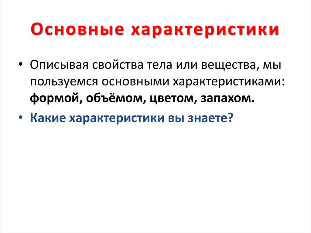 Основные характеристики• Описывая свойства тела или вещества, мы