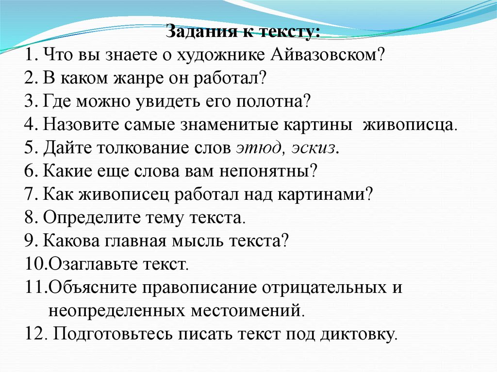 Задания к тексту:1. Что вы знаете о художнике Айвазовском?