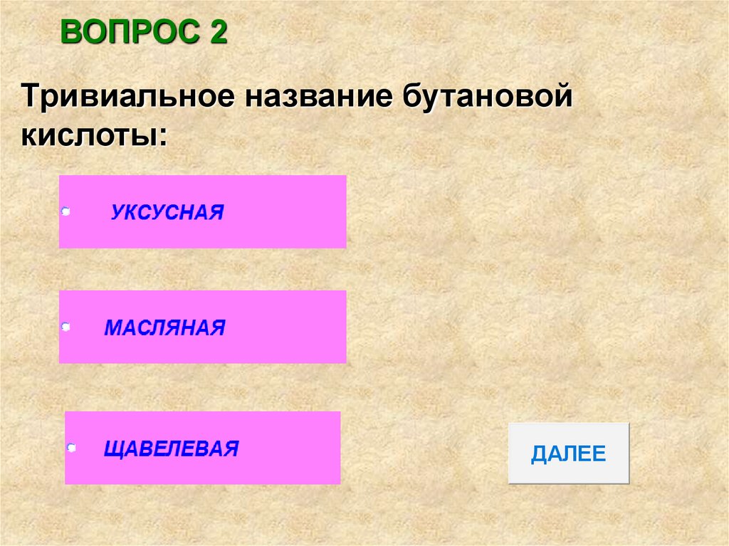 ВОПРОС 2Тривиальное название бутановой