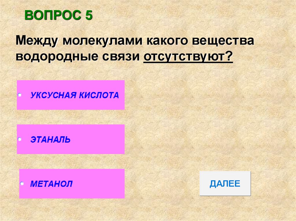 ВОПРОС 5Между молекулами какого вещества