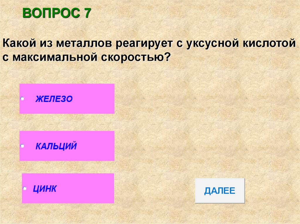 ВОПРОС 7Какой из металлов реагирует с уксусной кислотой