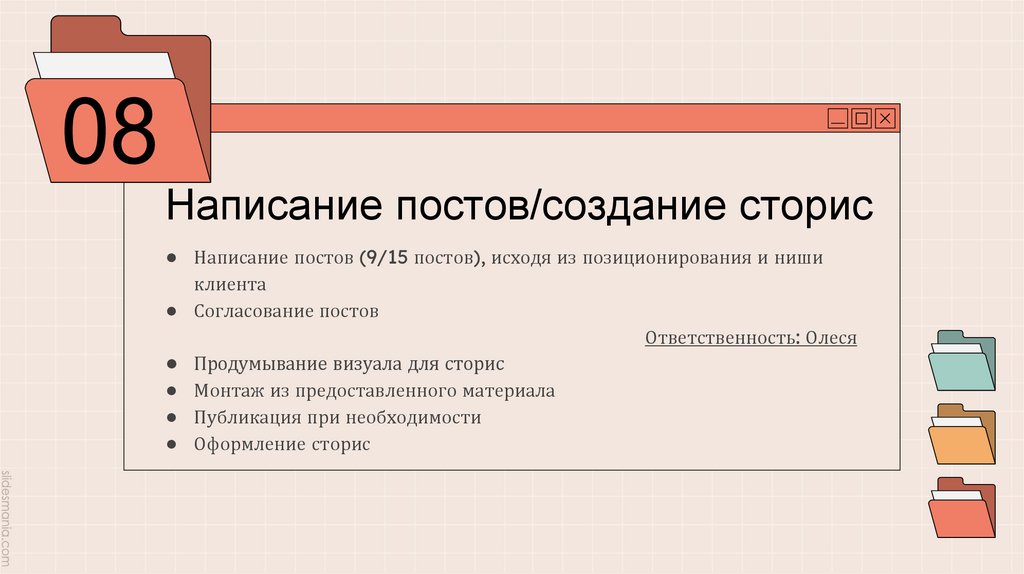 Написание постов/создание сторис● Написание постов (9/15 постов), исходя из позиционирования и ниши