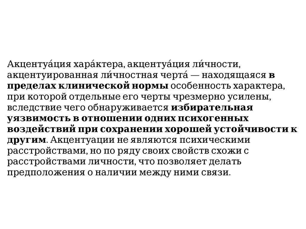 Акцентуа́ ция хара́ ктера, акцентуа́ ция ли́ чности,акцентуированная ли́ чностная черта́ — находящаяся в