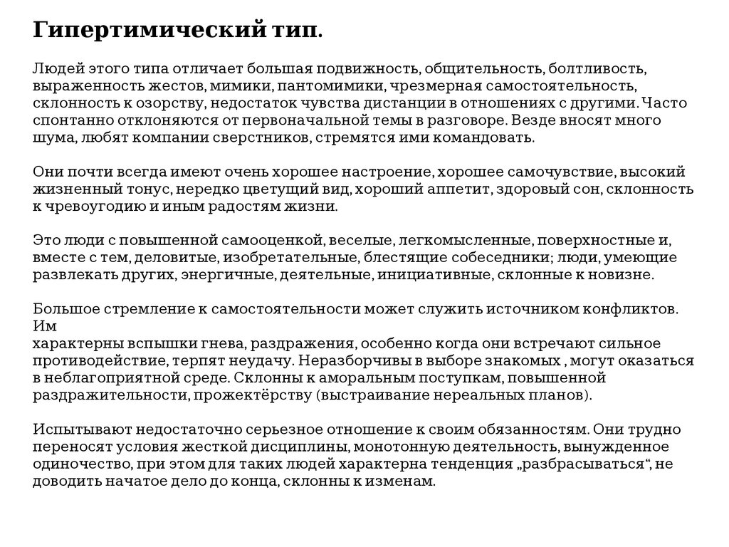 Гипертимический тип.Людей этого типа отличает большая подвижность, общительность, болтливость,