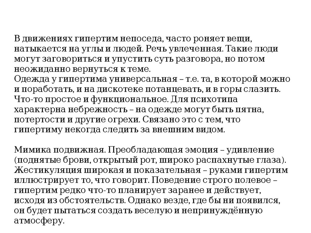 В движениях гипертим непоседа, часто роняет вещи,натыкается на углы и людей. Речь увлеченная. Такие люди