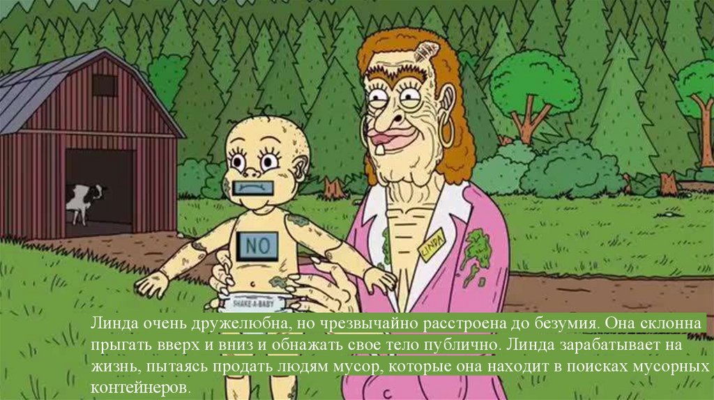 Линда очень дружелюбна, но чрезвычайно расстроена до безумия. Она склоннапрыгать вверх и вниз и обнажать свое тело публично. Линда зарабатывает на