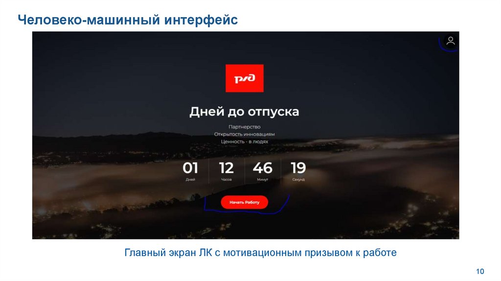 Человеко-машинный интерфейсГлавный экран ЛК с мотивационным призывом к работе