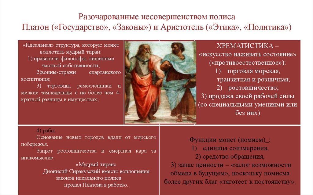 Разочарованные несовершенством полисаПлатон («Государство», «Законы») и Аристотель («Этика», «Политика»)