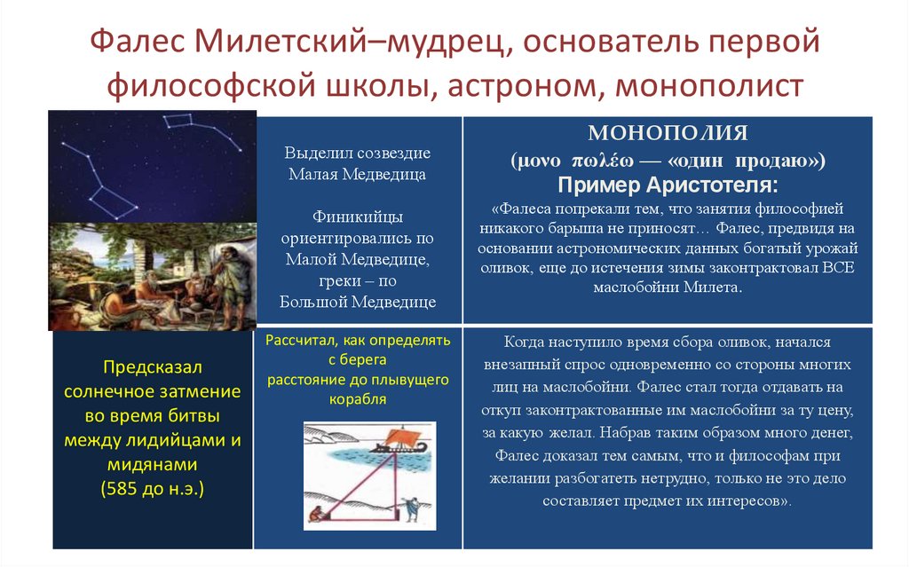 Фалес Милетский–мудрец, основатель первойфилософской школы, астроном, монополист