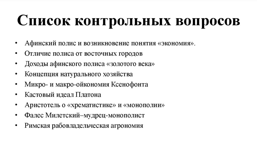 Список контрольных вопросовАфинский полис и возникновение понятия «экономия».