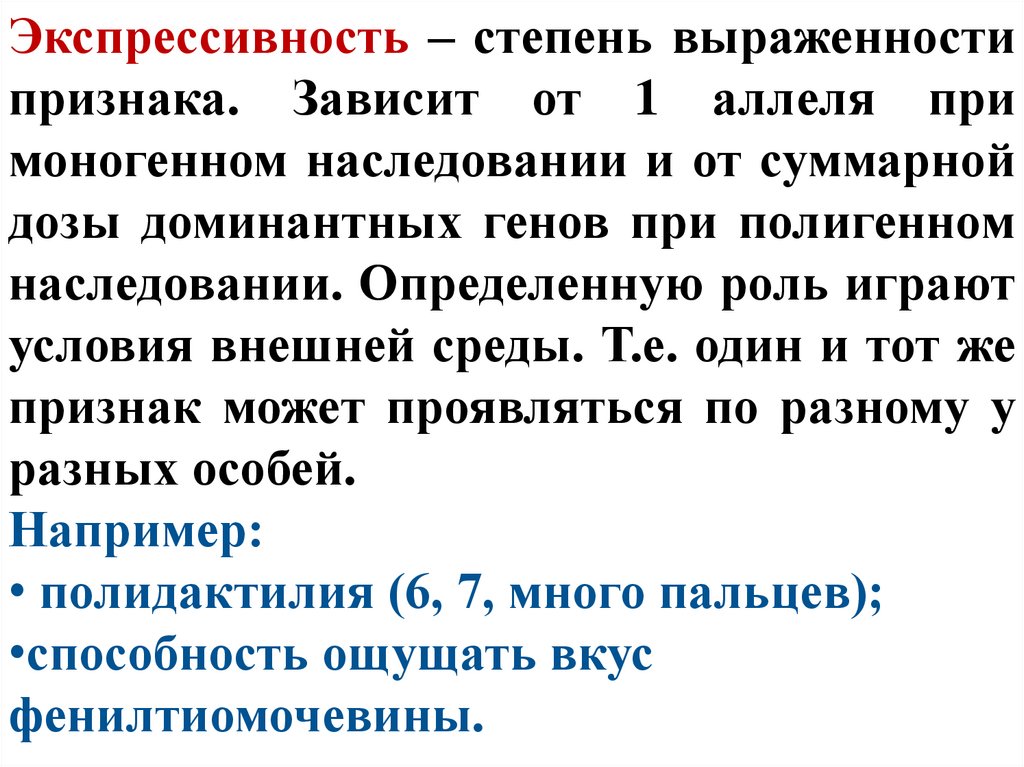 Экспрессивность – степень выраженностипризнака. Зависит от 1 аллеля при