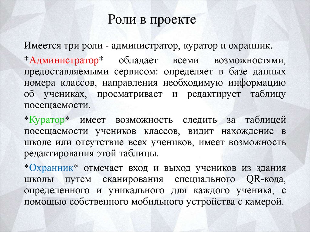 Роли в проектеИмеется три роли - администратор, куратор и охранник.