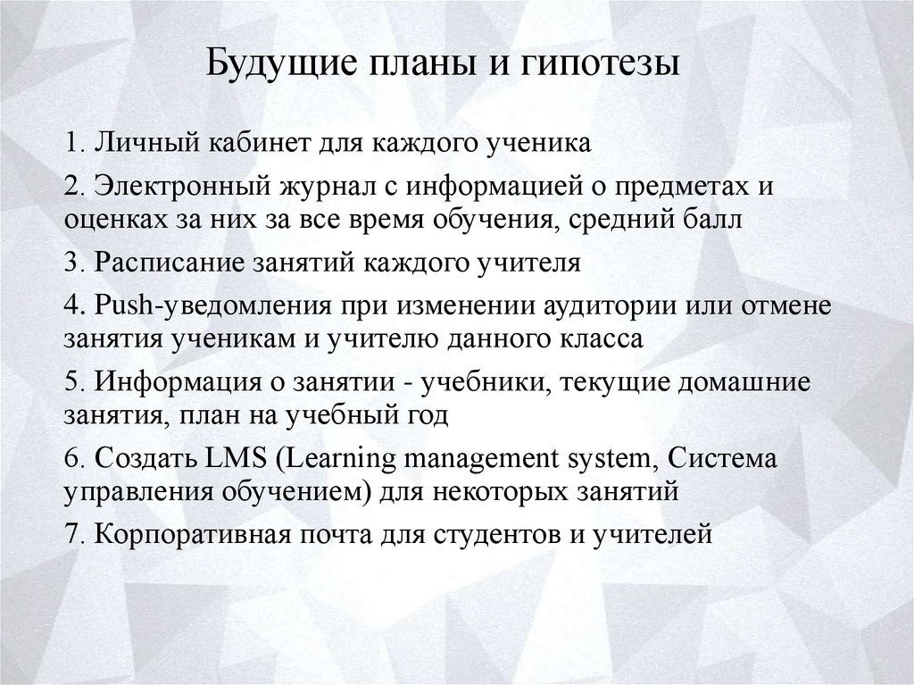 Будущие планы и гипотезы1. Личный кабинет для каждого ученика