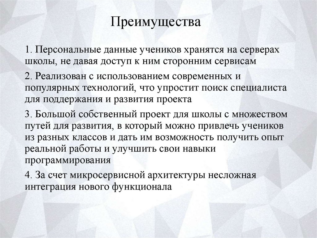 Преимущества1. Персональные данные учеников хранятся на серверах