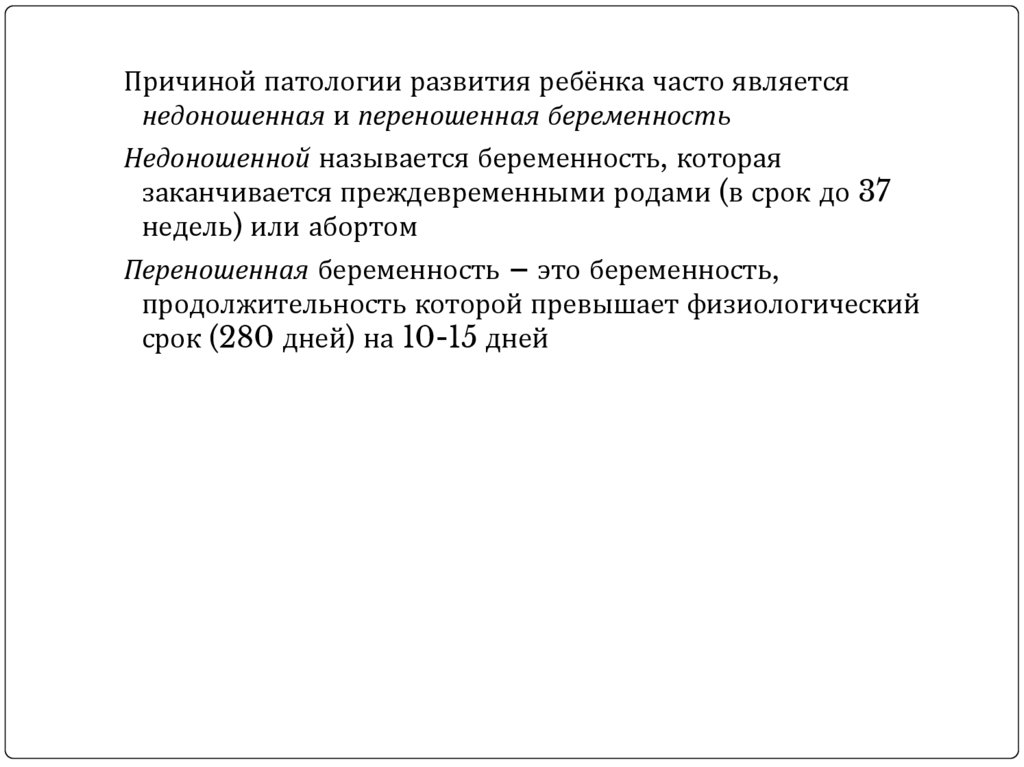 Причиной патологии развития ребёнка часто являетсянедоношенная и переношенная беременность