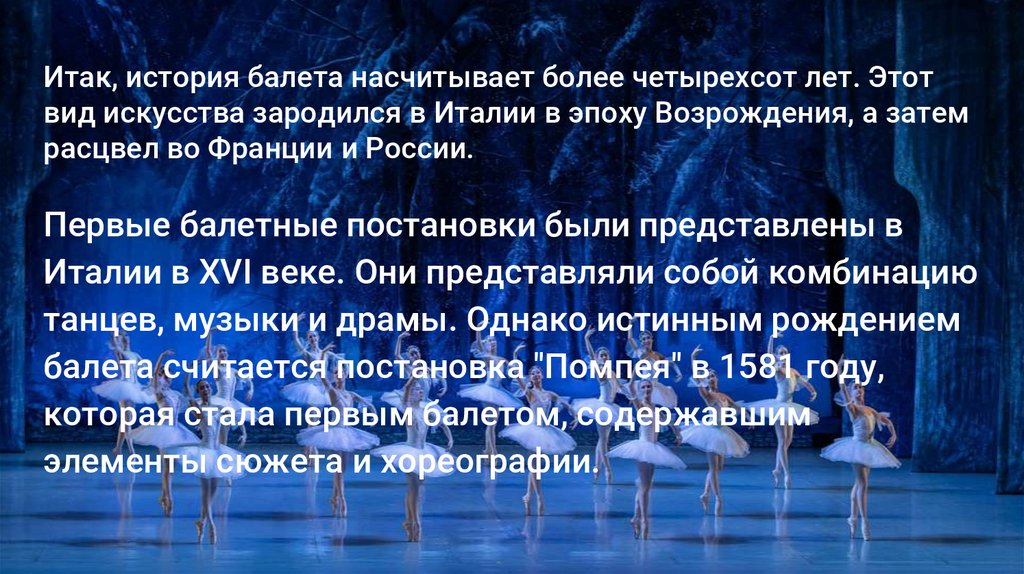 Итак, история балета насчитывает более четырехсот лет. Этотвид искусства зародился в Италии в эпоху Возрождения, а затем