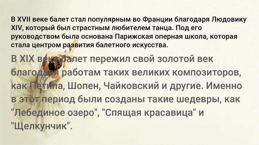 В XVII веке балет стал популярным во Франции благодаря ЛюдовикуXIV, который был страстным любителем танца. Под его