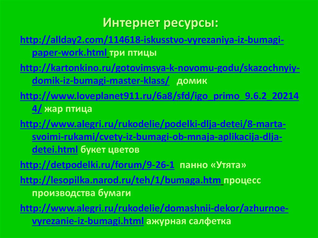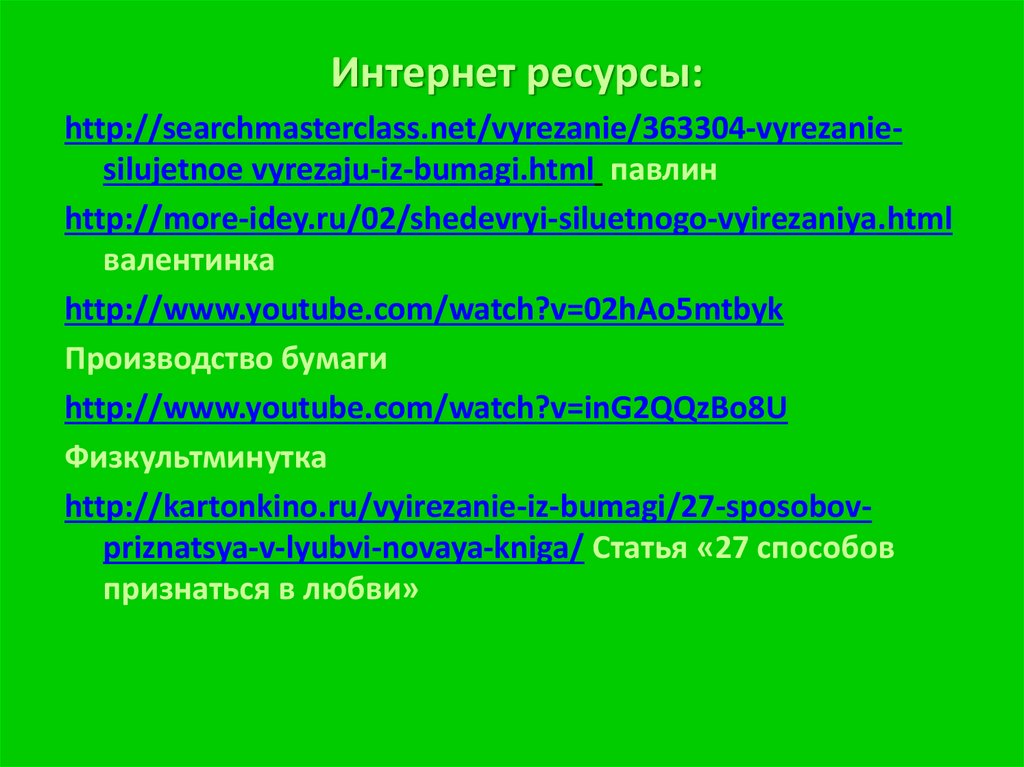 Интернет ресурсы:http://searchmasterclass.net/vyrezanie/363304-vyrezaniesilujetnoe vyrezaju-iz-bumagi.html павлин