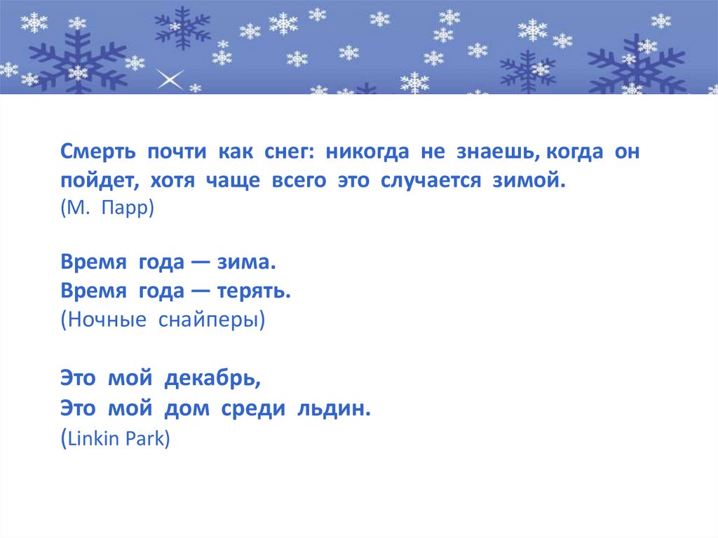 Смерть почти как снег: никогда не знаешь, когда онпойдет, хотя чаще всего это случается зимой.