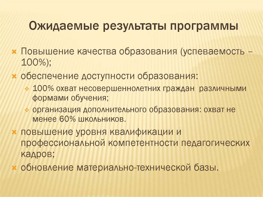Ожидаемые результаты программыПовышение качества образования (успеваемость –