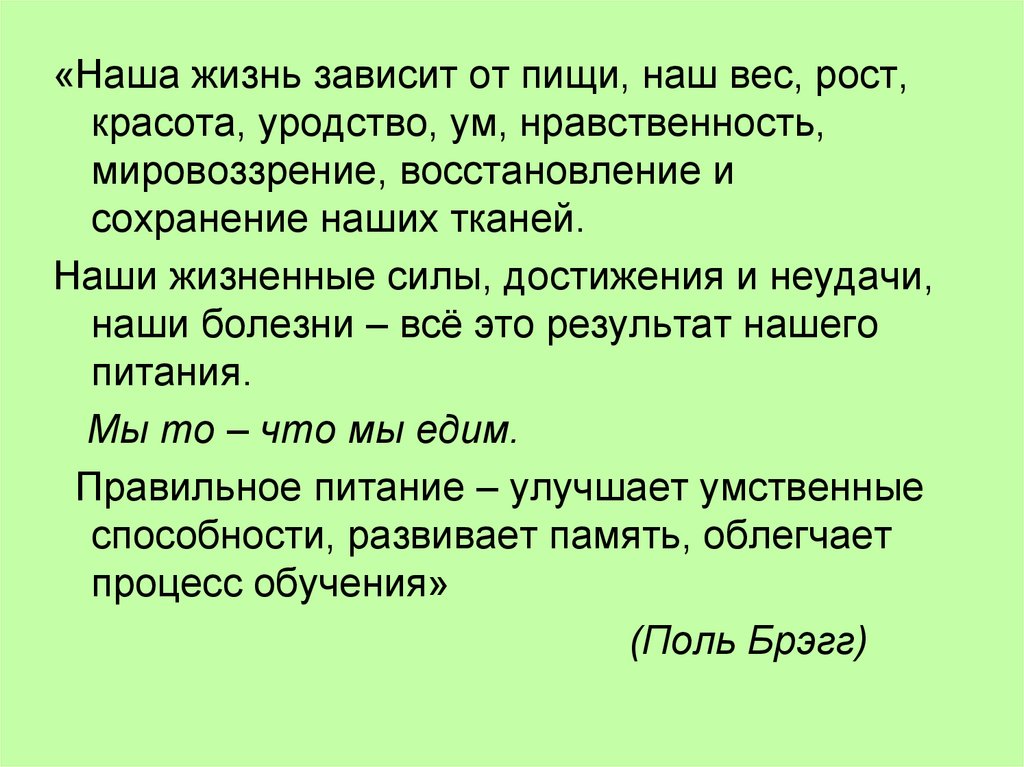 «Наша жизнь зависит от пищи, наш вес, рост,красота, уродство, ум, нравственность,