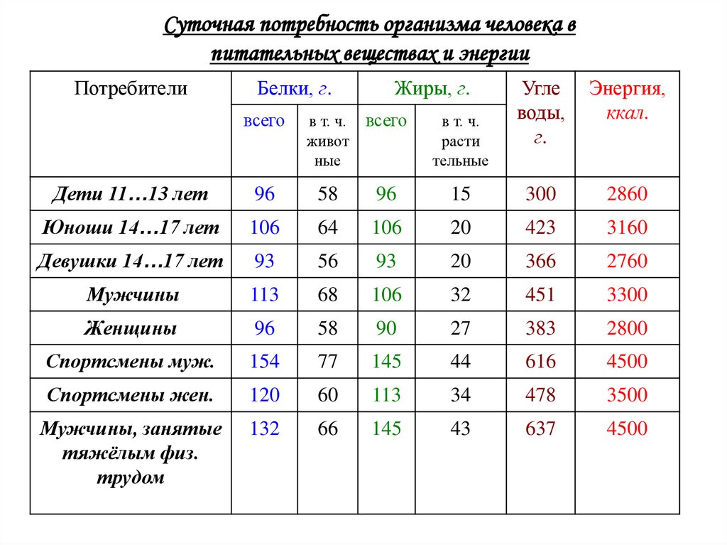 3. Подсчитайте калорийность и питательную ценность обеда, завтрака,