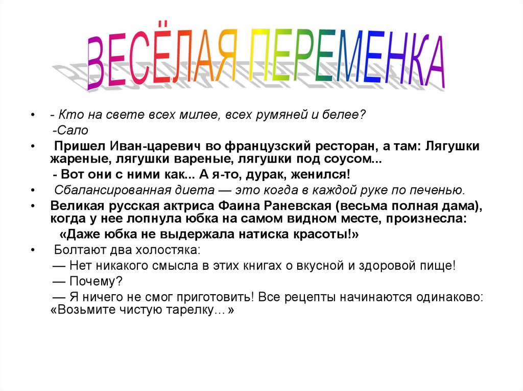 Оборудование: таблицы — примерный перечень блюд с калорийностью