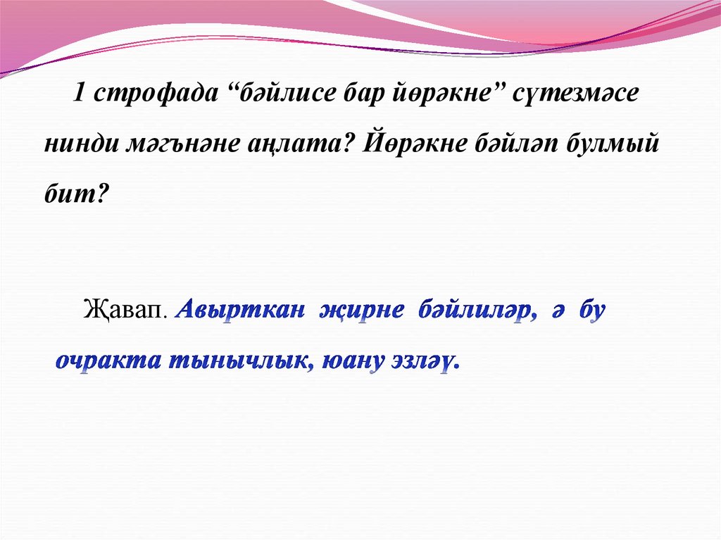 1 строфада “бәйлисе бар йөрәкне” сүтезмәсенинди мәгънәне аңлата? Йөрәкне бәйләп булмый