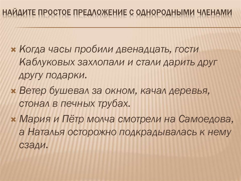 НАЙДИТЕ ПРОСТОЕ ПРЕДЛОЖЕНИЕ С ОДНОРОДНЫМИ ЧЛЕНАМИКогда часы пробили двенадцать, гости