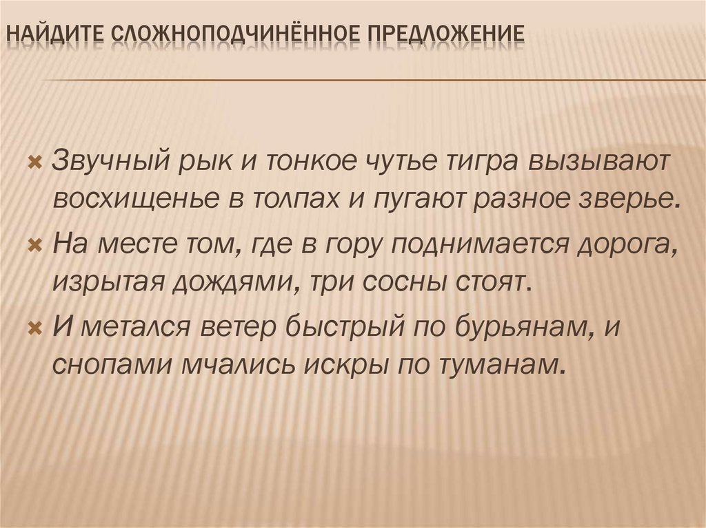 НАЙДИТЕ СЛОЖНОПОДЧИНЁННОЕ ПРЕДЛОЖЕНИЕЗвучный рык и тонкое чутье тигра вызывают