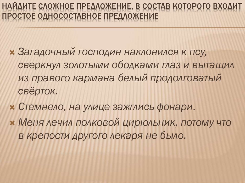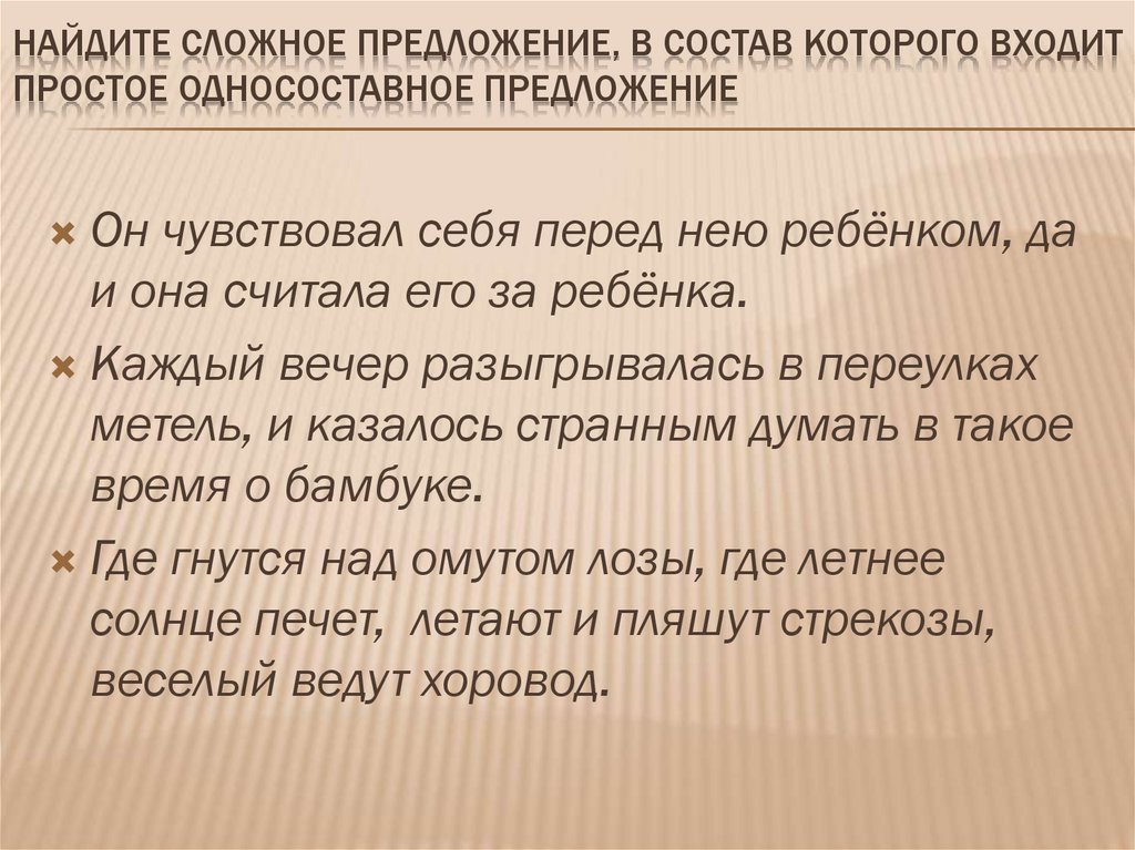 НАЙДИТЕ СЛОЖНОЕ ПРЕДЛОЖЕНИЕ, В СОСТАВ КОТОРОГО ВХОДИТПРОСТОЕ ОДНОСОСТАВНОЕ ПРЕДЛОЖЕНИЕ
