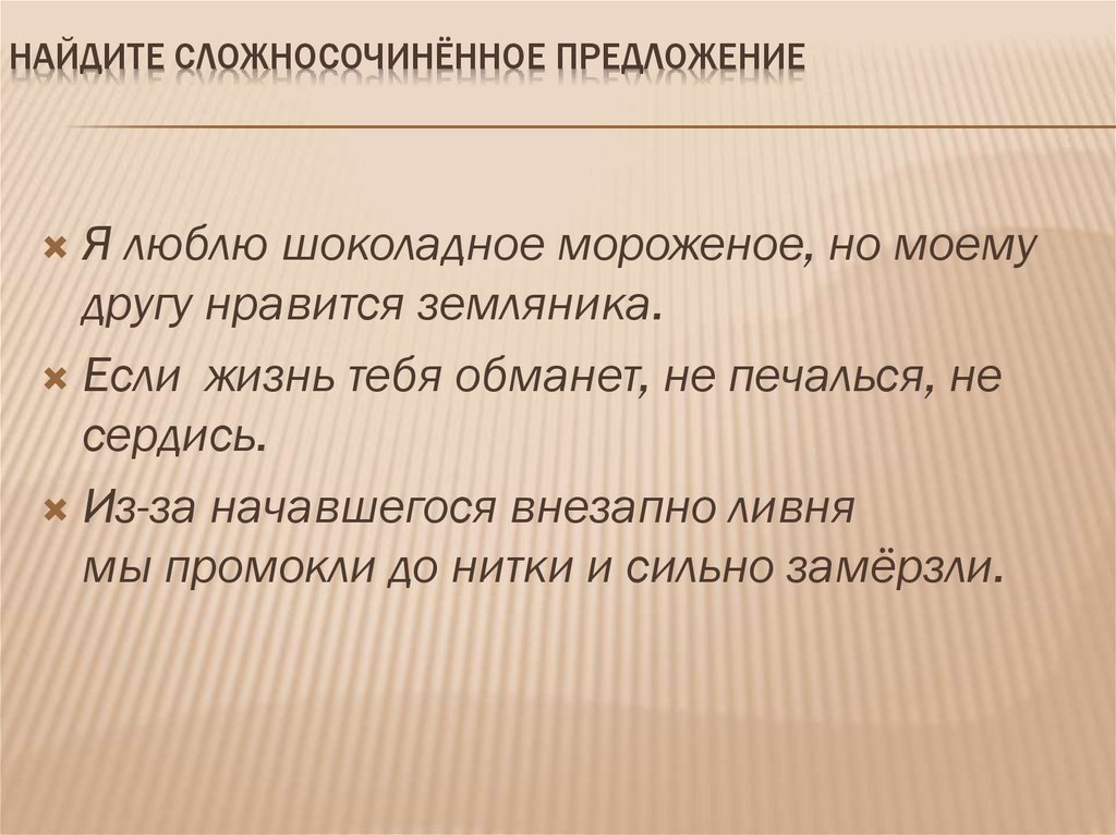 НАЙДИТЕ СЛОЖНОСОЧИНЁННОЕ ПРЕДЛОЖЕНИЕЯ люблю шоколадное мороженое, но моему
