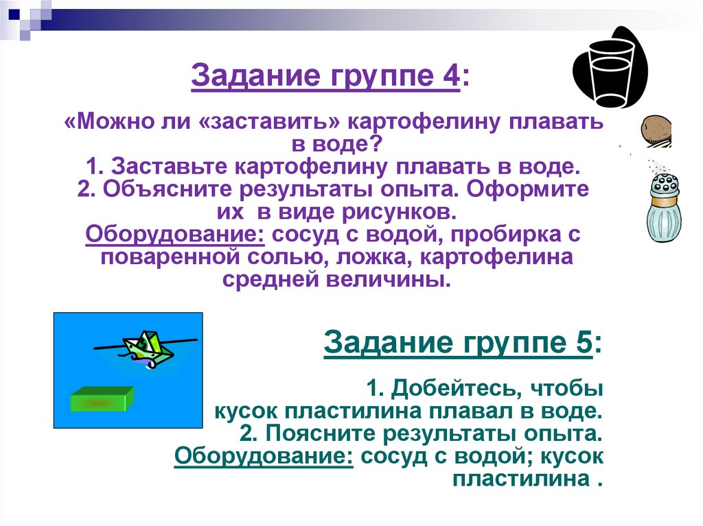 Задание группе 4:«Можно ли «заставить» картофелину плавать