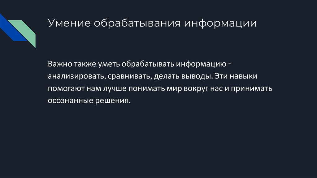 Умение обрабатывания информацииВажно также уметь обрабатывать информацию анализировать, сравнивать, делать выводы. Эти навыки
