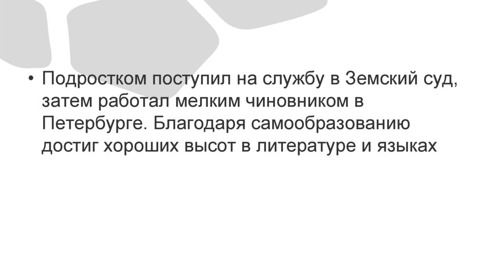 • Подростком поступил на службу в Земский суд,затем работал мелким чиновником в