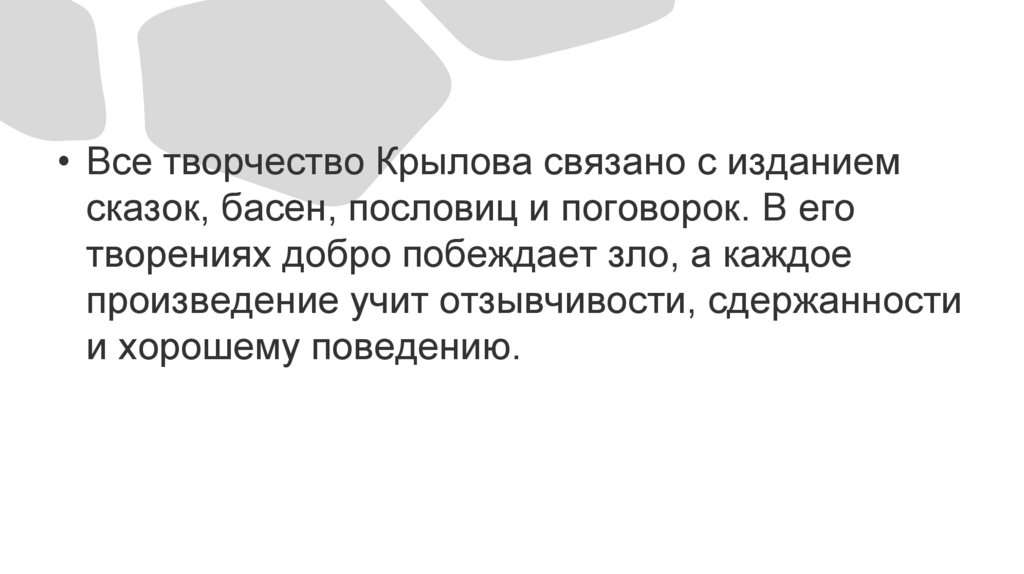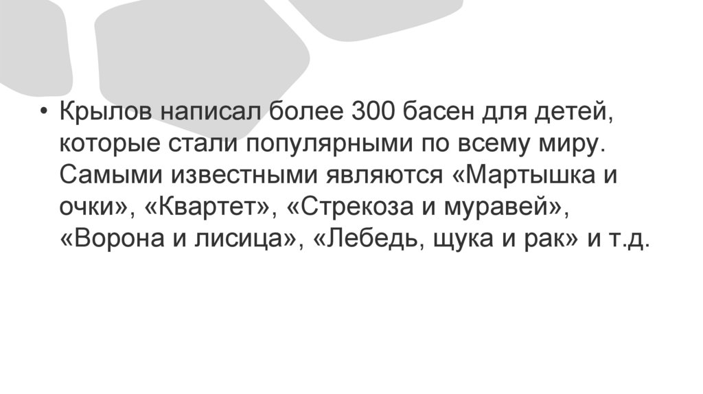 • Крылов написал более 300 басен для детей,которые стали популярными по всему миру.
