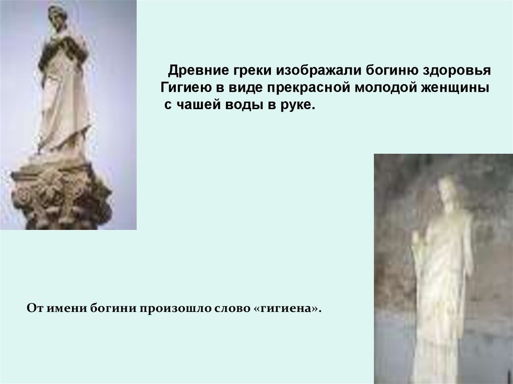 Древние греки изображали богиню здоровьяГигиею в виде прекрасной молодой женщины