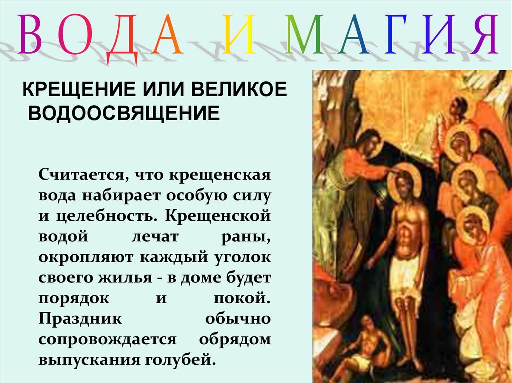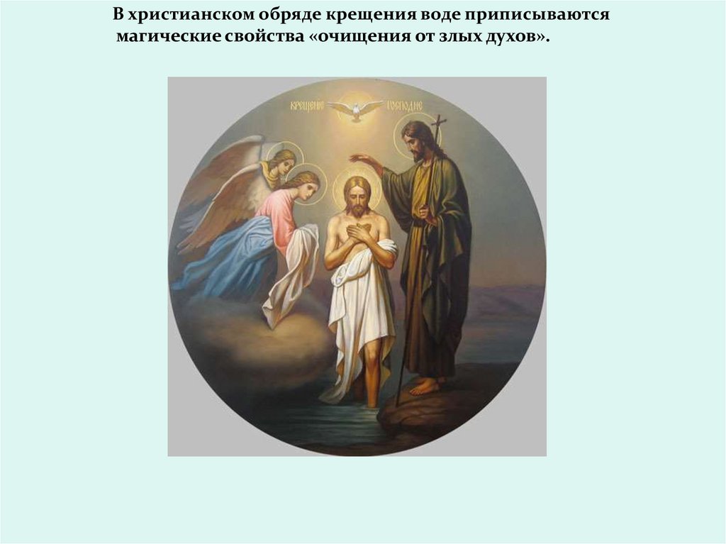 В христианском обряде крещения воде приписываютсямагические свойства «очищения от злых духов».
