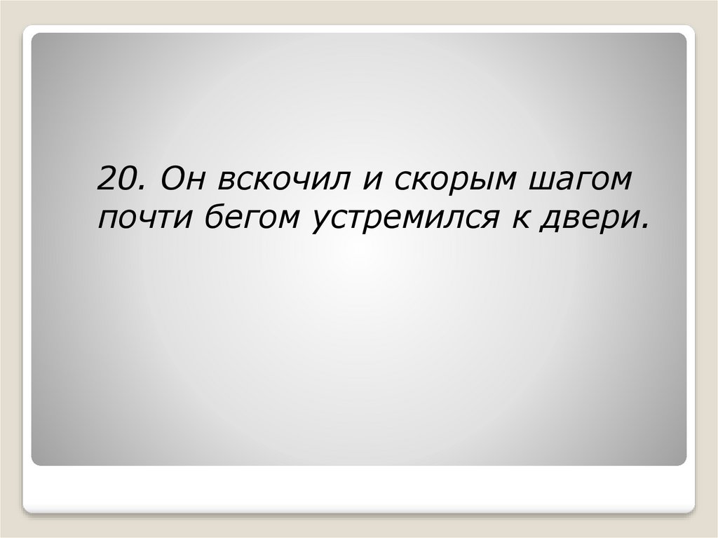 20. Он вскочил и скорым шагомпочти бегом устремился к двери.